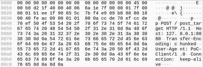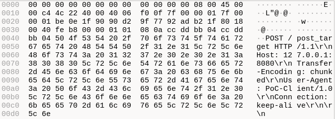 As we are building a header that will be encoded as simple ASCII, we truly want to explicitly write the line breaks, as they are important for the packet structure, delimiting each line. But note that each line break is written as \\r\\n, not simply \r\n. Accidentally, writing in this way, we end up scapping the backslash and getting the literal text \r\n, and not the line break character we would expect. This explains why we saw so many \r\n in Wireshark. But, as this behavior was present in the whole Python malicious script, we don’t have any true line break! The packet we were seeing is just a giant single line.